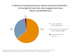 Für das tägliche Leben reiche 64 Prozent der Befragten ihr Haushaltsnettoeinkommen aus, heißt es weiter. 34 Prozent sagten, dass das Einkommen zwar reiche, aber sie jede Ausgabe abwägen müssten. Bei 3 Prozent reiche das Geld überhaupt nicht für den Alltag aus.