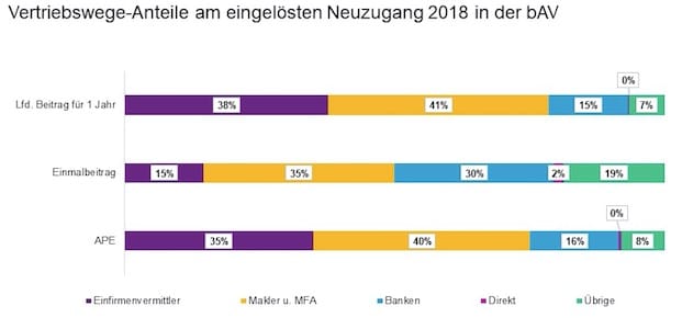 Nach der privaten Altersvorsorge sei die bAV die zweitwichtigste Produktgruppe für Einfirmenvermittler, Makler und Mehrfachagenten sowie für Banken. Das zeige sich in den bAV-Anteilen der einzelnen Vertriebswege. Für den Direktvertrieb spiele die bAV nur eine untergeordnete Rolle.