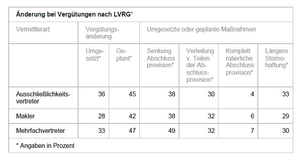 Die Vermittler wurden auch befragt, welche Art von Veränderungen durch das LVRG im Vergütungssystem erfolgt oder geplant ist. Am häufigsten wurde die Senkung des Abschlussprovisionssatzes ohne weiteren Ausgleich genannt. Relativ oft werden Teile der Abschlussprovision auf die Laufzeit verteilt sowie die Stornohaftung verlängert. Eher bedeutungslos scheint bisher die Variante zu sein, die gesamte Vergütung auf die Laufzeit zu verteilen.