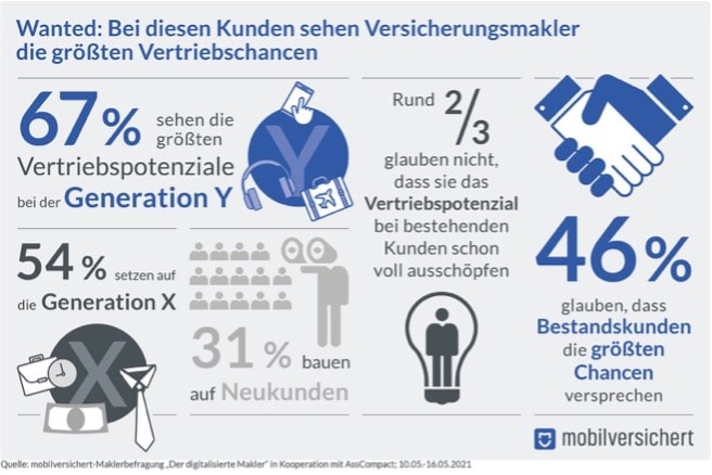 Die digital erfahrene Generation Y birgt die größten vertrieblichen Chancen. Davon sind 67 Prozent der Versicherungsmakler „voll“ oder „eher“ überzeugt, wie eine aktuell Umfrage der Brokertech-Plattform „Mobilversichert“ in Zusammenarbeit mit Asscompact zeigt. Darauf folgen die Generation X mit 54 Prozent und die Generation Z mit 47 Prozent. Babyboomer landen mit 34 Prozent auf dem letzten Platz des Rankings.