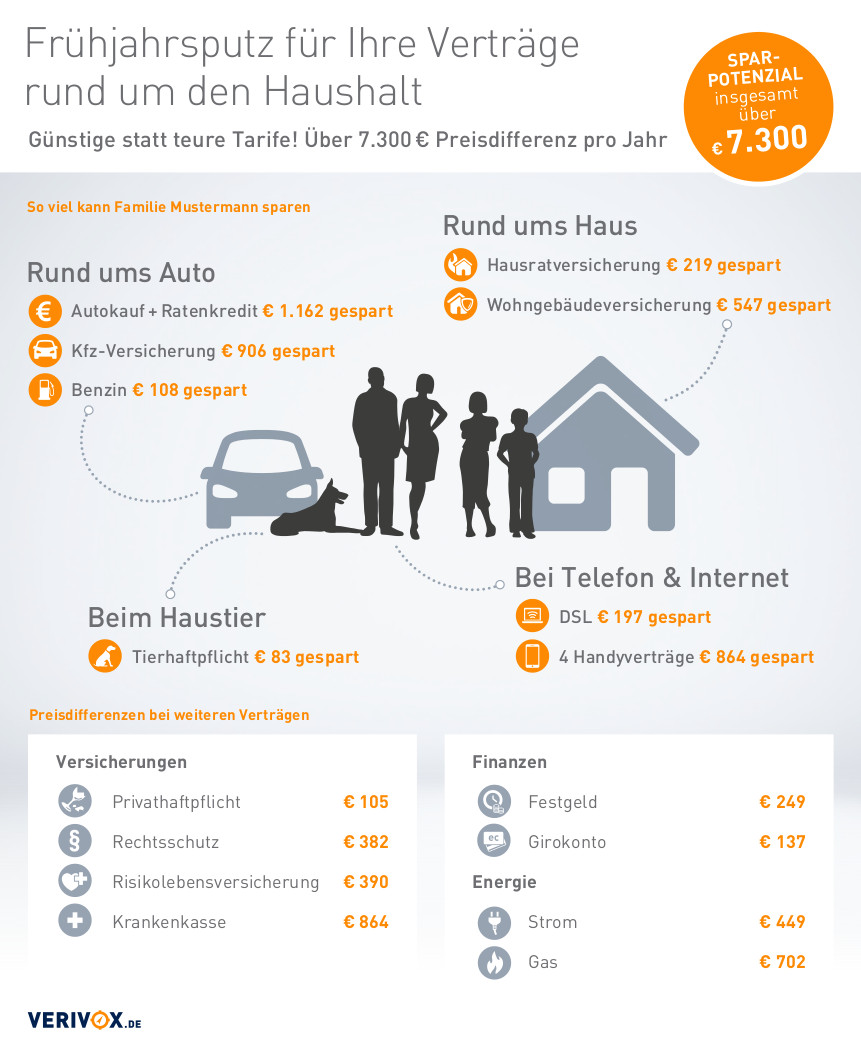 Untersucht haben die Analysten 19 Verträge einer Modellfamilie aus Heidelberg mit zwei Kindern – 8 Versicherungs-, 5 Telekommunikations-, 3 Bank-, 2 Energieverträge und ein Autokauf. Die größte Differenz gab es im Bereich Autokauf und -kredit mit 1.162 Euro im Jahr. Aber auch bei der Kfz-Versicherung kann die Modellfamilie laut Verivox 906 Euro im Jahr sparen.
