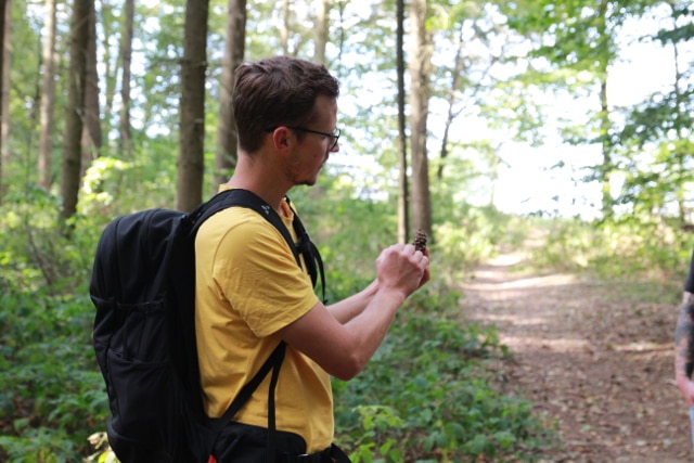 Förster Eichler erklärt den Unterschied zwischen einem Fichtenzapfen und einem Douglasienzapfen, beides keine heimischen Bäume. Das Sterben der Nadelbäume in Trockenperioden sowie die erhöhte Waldbrandgefahr wären vermeidbar, wenn Misch- oder Laubwälder in Deutschland vorherrschen würden. „Buchenwälder brennen nicht“, so der Experte.