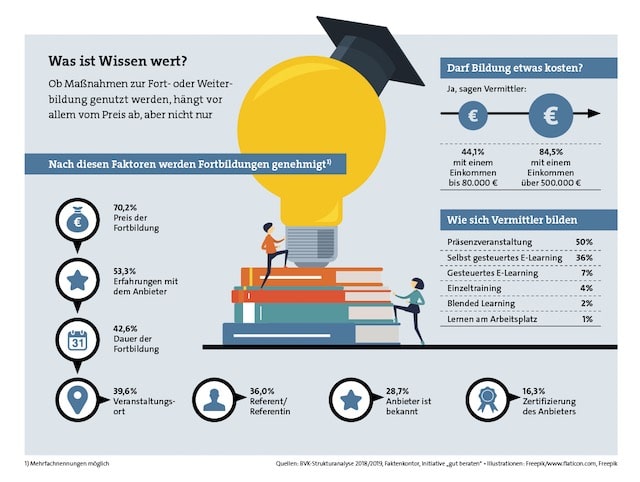 Wie sind diese Ergebnisse einzuschätzen? Machen es sich 42 Prozent der Vermittler zu leicht, indem sie ausschließlich auf kostenlose Veranstaltungen setzen? „Die wichtigste Maschine eines Maklers, mit der er sein Geld verdient, ist sein Gehirn beziehungsweise sein Know-how. Wenn er diese Maschine nicht pflegt und er nicht bereit ist, für diese Pflege auch Geld in die Hand zu nehmen, dann versiegt irgendwann seine Geldeinnahmequelle“, sagt Wolfgang Kuckertz, Vorstand der Going Public Akademie für Finanzberatung. In der Folge spielten jene 42 Prozent, „die nicht in sich selbst investieren möchten, mit ihrer Existenz“, so Kuckertz. „Diese Personengruppe wird mit hoher Wahrscheinlichkeit entweder ihre Einstellung verändern oder den Markt verlassen.“