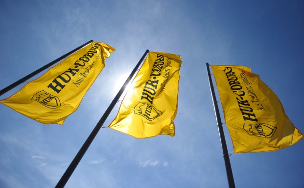 „Aus Tradition günstig“ lautet der Schriftzug auf den Flaggen, die vor der Unternehmenszentrale der Huk-Coburg aufgestellt sind. Der Erzrivale der Allianz im Kfz-Versicherungsgeschäft kann sich mit 8,4 Punkten deutlich vor der Konkurrenz aus München behaupten. Foto: dpa/picture alliance