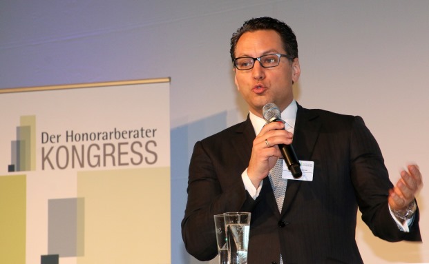 Sebastian Grabmaier, Jung, DMS & Cie., im Panel „Einstieg in die Honorarberatung für Versicherungsvermittler“. Honorarvermittlung kann als Baustein des Übergangs in die Honorarberatung oder zu Mischmodellen genutzt werden, meinte der Poolchef. „In je