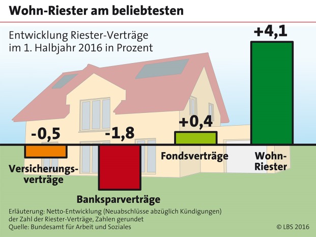 Vergleicht man den Wohn-Riester mit anderen Riester-Varianten wird klar: Die Eigenheimrente schlägt Versicherungs-, Bankspar- und Fondsverträge deutlich. Im ersten Halbjahr 2016 legte die Zahl der abgeschlossenen Verträge um 4,1 Prozent zu. Ein so starkes Plus gab es bei keiner anderen Riester-Vorsorge.