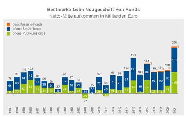 Die kräftigen Mittelzuflüsse und die steigenden Aktienkurse hätten zu der neuen Bestmarke beim verwalteten Vermögen geführt. In den vergangenen zehn Jahren sei dieses um über 140 Prozent gestiegen. „Der deutsche Fondsmarkt bestätigt damit einmal mehr seine führende Position in Europa.“