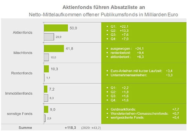 Beim Neugeschäft der offenen Publikumsfonds führen Aktienfonds mit 50 Milliarden Euro die Absatzliste an. Allein im ersten Quartal des vergangenen Jahres erzielten sie nach BVI-Angaben fast die Hälfte des Neugeschäfts. Im Gesamtjahr 2021 haben sich die Zuflüsse in Aktienfonds gegenüber 2020 (20,9 Milliarden Euro) mehr als verdoppelt. Aktiv gemanagte Aktienfonds erzielten netto 31,8 Milliarden Euro und Aktien-ETFs 18,2 Milliarden Euro. Danach folgen Mischfonds mit Zuflüssen in Höhe von 41,8 Milliarden Euro, Rentenfonds (10,3 Milliarden Euro) und Immobilienfonds (7,2 Milliarden Euro).