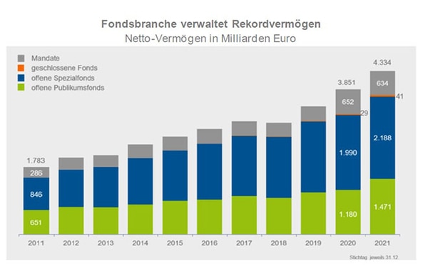 Nach Angaben der Europäischen Zentralbank ist Deutschland mit einem Anteil von 27 Prozent der größte Fondsmarkt in der EU. In Deutschland sind offene Spezialfonds mit einem Vermögen von 2.188 Billionen Euro die größte Fondsgruppe. Zusammen mit den Mandaten im Wert von 634 Milliarden Euro entfallen fast zwei Drittel des verwalteten Gesamtvermögens auf das rein institutionelle Geschäft zum Beispiel mit Altersvorsorge-Einrichtungen und Versicherungsgesellschaften. Eine weitere Bestmarke gibt es bei den offenen Publikumsfonds. Sie verwalten ein Rekordvermögen von 1.471 Billionen Euro. Auch das Netto-Vermögen geschlossener Fonds ist in den vergangenen drei Jahren von 14 auf 41 Milliarden Euro gestiegen.