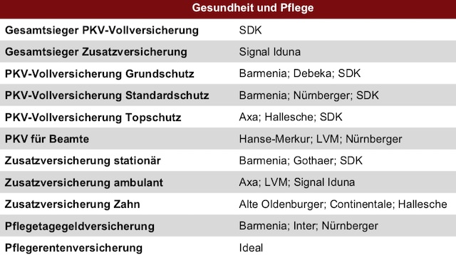 Kommen wir zum Bereich Gesundheit und Pflege. Hier setzen sich die SDK als Gesamtsieger Krankenvollversicherung und die Signal Iduna als bester Anbieter in der Zusatzverischerung durch.