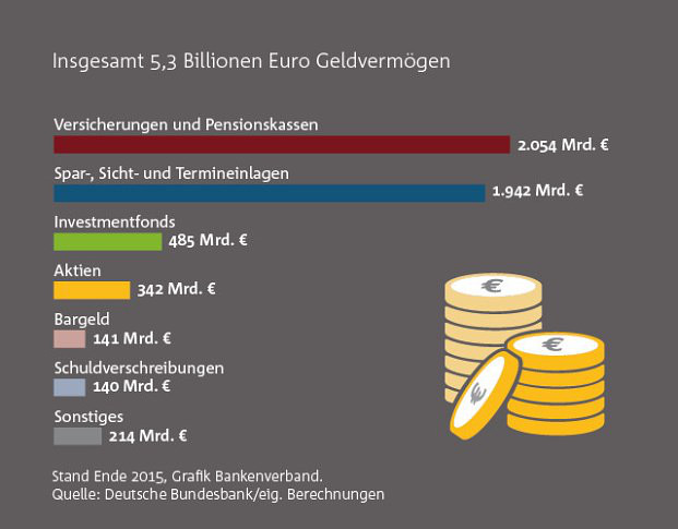 Trotz des extrem niedrigen Zinsniveaus hat das Geldvermögen der Bundesbürger Ende 2015 einen neuen Höchstwert erreicht: Mit 5,3 Billionen Euro lag es um knapp 5 Prozent höher als im Vorjahr. Das geht aus einer Studie des Bankenverbands hervor.