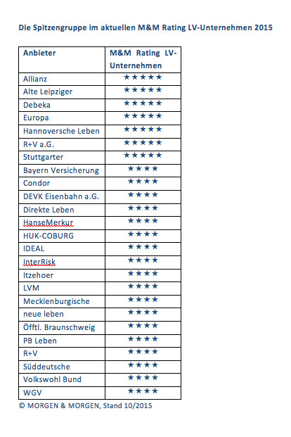 Das Analysehaus Morgen & Morgen (M&M) hat im Rahmen seines LV-Unternehmens-Ratings unter anderem die Allianz mit 5 Sternen ausgezeichnet. Auch Alte Leipziger, Debeka, Europa, Hannoversche Leben sowie R+V und Stuttgarter erzielten die Höchstpunktzahl. Für das Rating nahm M&M Kosten, Sicherheitspolster, Erträge und Marktstellung der Lebensversicherer unter die Lupe. Dabei erhielten genauso viele Versicherer 5 Sterne wie im Vorjahr. Damals war jedoch noch die Interrisk unter diesen Versicherern. Nun findet sich hier stattdessen die Hannoversche Leben.