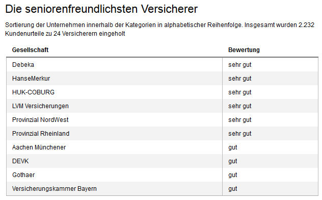 Die Forscher sammelten 2.232 Kundenurteile zu 24 Senioren-Versicherern ein. Dabei haben sie 17 Service- und Leistungsmerkmale aus den folgenden fünf Kategorien bewertet: