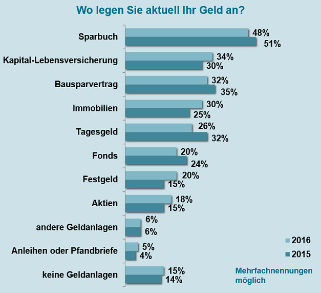 Von Aktien und Fonds versprechen sich die Anleger zwar höhere Renditen, aber nur jeder Fünfte investiert in Fonds, direkte Aktieninvestments stiegen leicht von 15 auf 18 Prozent, doch 15 Prozent legen derzeit gar kein Geld an.