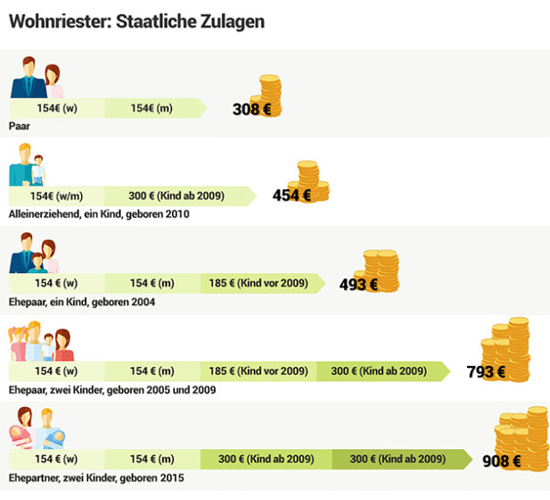 Die Grafik zeigt exemplarisch für den Wohn-Riester, wie hoch die staatlichen Zulagen bei dem Produkt sind. Gerade für Familien mit vielen Kindern lohnt sich die Förderung.