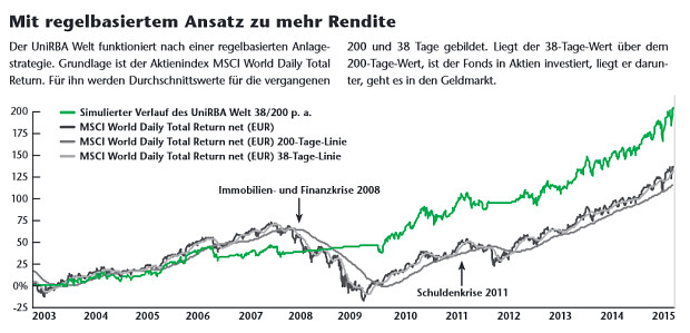 Liegt der 38-Tage-Schnitt aber unter der 200-Tage-Linie, wird das Fondsvermögen in Geldmarktfonds umgeschichtet. Ein Wechselsignal wird ausgelöst, wenn die 38-Tage-Linie die 200-Tage-Linie um mehr als ein Prozent unter- beziehungsweise überschreitet.