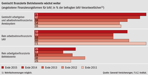 Beim Thema betriebliche Altersvorsorge (bAV) ist den Arbeitgebern kaum etwas vorzuwerfen. Sie haben ihr Angebot 2015 weiter ausgebaut. Jeder Mittelständler kann seinen Mitarbeitern mindestens eine Möglichkeit anbieten, über den Betrieb für später vorzusorgen.