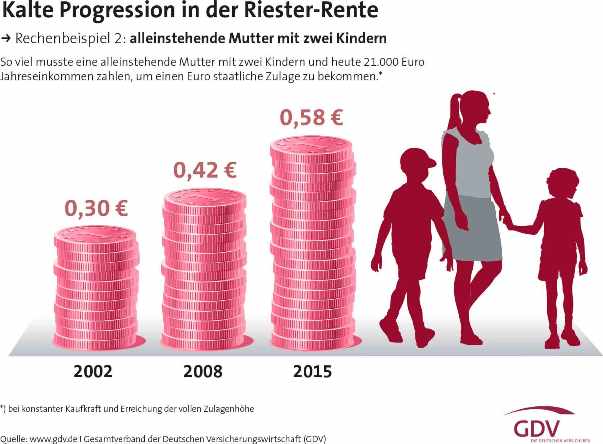 Diesen schleichenden Anstieg des Eigenbeitrags bei der Riester-Rente bezeichnen Experten als „Kalte Progression“. Betroffen seien vor allem Sparer aus den unteren Einkommensgruppen, die ausschließlich von der Zulagenförderung profitierten, schreibt Autor Dennis Schmidt-Bordemann. Ein alleinstehender Arbeitnehmer, der in etwa den Mindestlohn verdiene, müsse heute beispielsweise 3 Euro bezahlen, um einen Euro staatliche Zulage zu erhalten. Das seien fast 30 Prozent mehr als 2002.