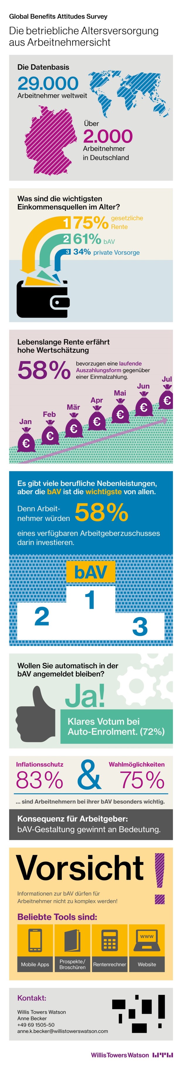 „Gute bAV-Angebote müssen nicht nur die Merkmale berücksichtigen, die seitens der Arbeitgeber relevant sind, auch die Arbeitnehmersicht ist erfolgsentscheidend. Es muss an den richtigen Stellschrauben gedreht werden“, sagt Thomas Jasper, Leiter der Abteilung „Ruhestand Westeuropa“ der Unternehmensberatung Willis Towers Watson. „Erst wenn Arbeitgeber es schaffen, den Mitarbeitern die betrieblichen Vorsorgeangebote verständlich und bedürfnisorientiert anzubieten, können diese die vorhandenen Modelle überhaupt zur Versorgung in Erwägung ziehen.“