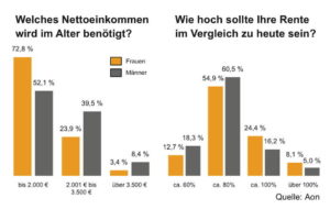 Frauen machen sich über ihre Rente meist keine Illusionen: Nur ein Viertel der Frauen (27,2 Prozent) gab im Rahmen einer Studie des Maklerunternehmens Aon an, später einmal mehr als 2.000 Euro netto pro Monat zu brauchen – wohl auch, weil Verzicht im Rentenalter von den Befragten bereits eingepreist wird. Zum Vergleich: Bei den Männern liegt dieser Anteil fast doppelt so hoch (47,9 Prozent).