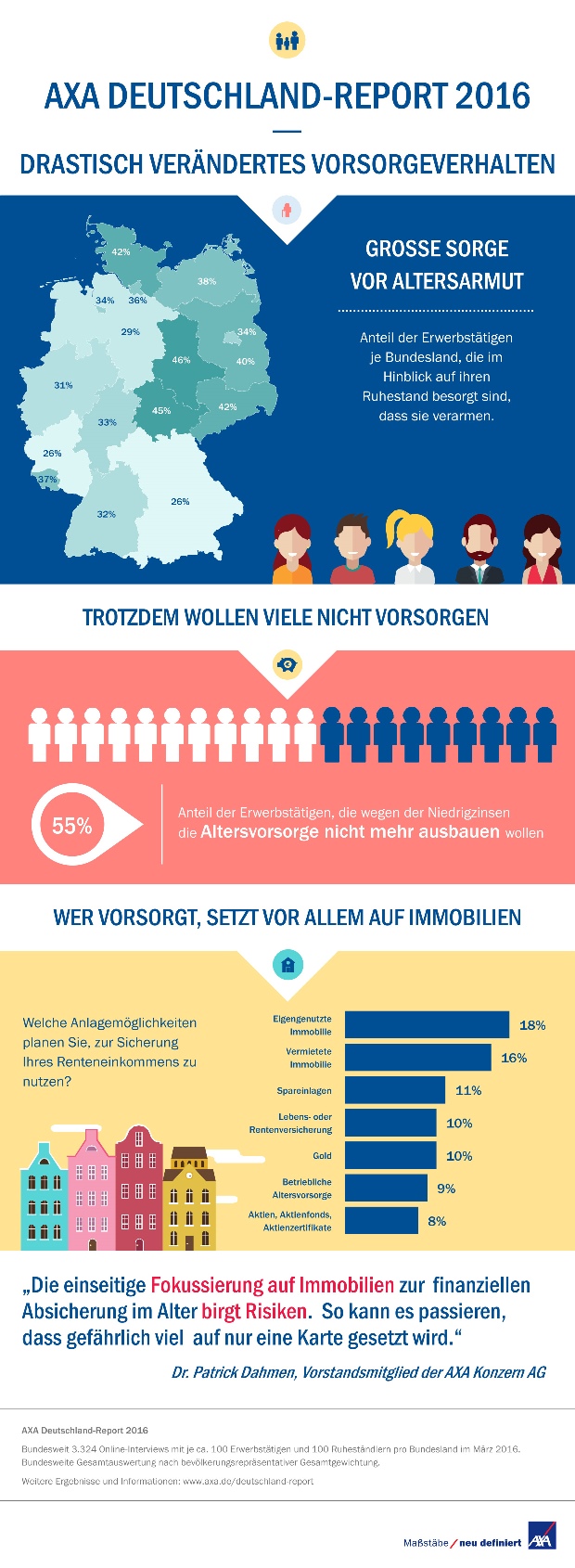 55 Prozent der arbeitenden Bevölkerung in Deutschland glaubt, dass sich weitere Anlagen nicht lohnen. Und bei denen, die noch nicht aufgegeben haben, gibt es einen richtigen „Run“ auf Immobilien zur Eigennutzung und Vermietung. Das zeigt der neue Axa Deutschland-Report.