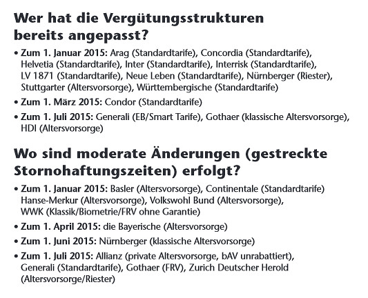Die Veränderungen müssen gemeinsam mit dem Vertrieb auf den Weg gebracht werden. Die Allianz etwa hat seit 1. Juli 2015 ein Wahlmodell für Verträge mit laufendem Beitrag in der privaten Altersvorsorge gestartet. Im neuen Modell werden 75 Prozent der bisherigen Abschlussvergütung mit dem Abschluss des Vertrags ausgezahlt, 25 Prozent über die vereinbarte Laufzeit verteilt.