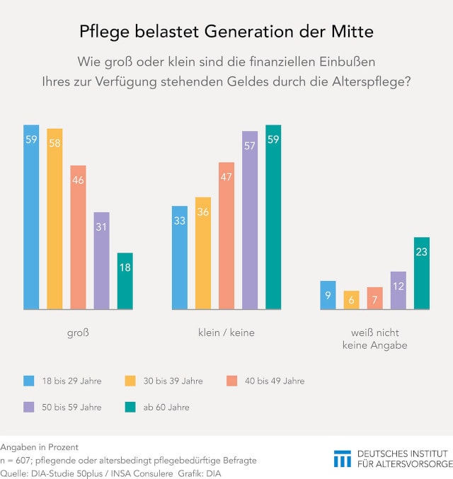 Wer Angehörige pflegt, verzichtet oft auf Einkommen. Knapp jeweils 60 Prozent in der Altersgruppe der 18- bis 29-Jährigen sowie der 30- bis 39-Jährigen, die Angehörige pflegen, bezeichnen die sich aus der Pflege ergebenden finanziellen Abstriche als groß. Immerhin: Mit zunehmendem Altem sinkt der Anteil derer, die ihre Einbußen als groß ansehen. Zu diesen Schlussfolgerungen gelangt das Deutsche Institut für Altersvorsorge (DIA) nach Auswertung der Ergebnisse der DIA-Studie 50plus. Sämtliche Ergebnisse der Befragung sollen Mitte des Jahres veröffentlicht werden.