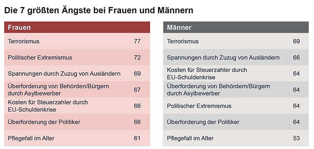 Die Terrorangst steigt um 21 Prozentpunkte im Vergleich zum Vorjahr und erreicht damit ihren bisherigen Höchstwert – und erstmals Platz 1 des Rankings. Extrem angewachsen sind auch die Ängste vor politischem Extremismus und vor Spannungen durch weiteren Zuzug von Ausländern. Beide Themen schrecken in diesem Jahr mehr als zwei Drittel aller Bundesbürger und klettern auf die Plätze 2 und 3. Auffällig: Die überwiegende Mehrheit der Deutschen befürchtet auch, dass Politiker und Behörden mit der Lösung der Probleme überfordert sind.