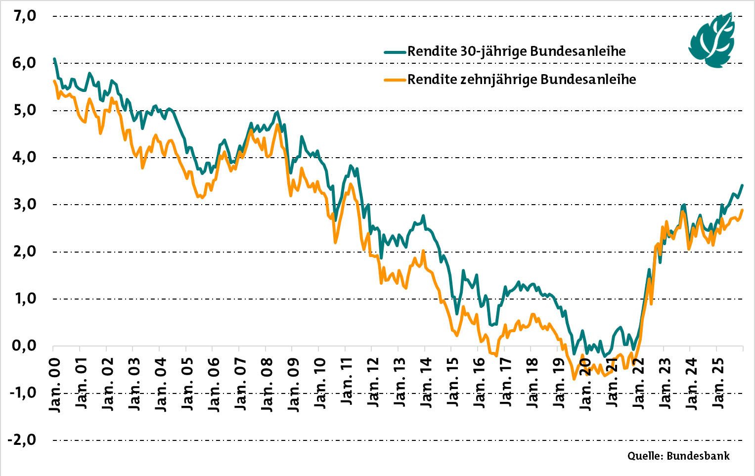 Es ist völlig unklar, wie schnell es geht und welches Ausmaß die Turbulenzen annehmen. Schließlich spielen zu viele weitere Faktoren dort mit hinein. Fakt ist allerdings, dass die Rendite für 30-jährige Bundesanleihen heute bei 3,55 Prozent liegen (Stand: 7. Januar 2026). Das ist der höchste Stand seit Juni 2011. Zehnjährige Bundesanleihen rentieren derzeit mit 2,80 Prozent, was es zuletzt allerdings im Herbst 2023 gab.