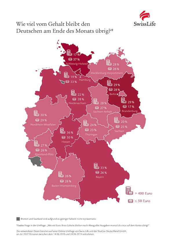 So liegt im Nordwesten des Landes die größte Diskrepanz zwischen Nettoverdienst und frei verfügbarem Einkommen. Gut jedem Dritten in Schleswig-Holstein (37 Prozent) und Hamburg (33 Prozent) bleiben vom Gehalt 50 Euro oder weniger übrig. Im Gegensatz dazu behauptet in Hessen (36 Prozent) und Bayern (33 Prozent) etwa jeder Dritte, 400 Euro und mehr nach allen Abzügen und festen Ausgaben zur Verfügung zu haben.
