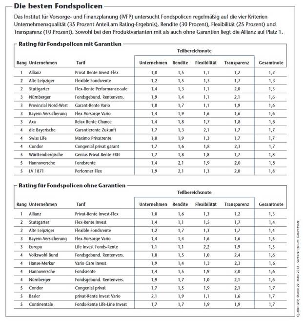 Der Fondspolicen-Markt ist dabei fest in der Hand einiger weniger Anbieter. Die Liste führt die Generali-Tochter Aachen-Münchener mit einem Marktanteil von gut 19 Prozent an. Auf dem zweiten Platz folgt mit rund 11 Prozent die Zurich, die sich schon vor Jahren auf das Fondspolicen-Geschäft spezialisiert hat, vor HDI.