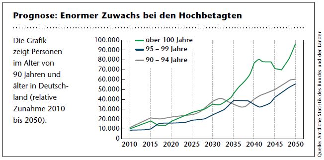 „Jahrhundert-Menschen faszinieren uns. Und wir geben dem Thema Langlebigkeit ein Gesicht“, sagt Martin Gräfer, Vorstand der Bayerischen. Das Motiv kommt nicht von ungefähr, denn Menschen in Deutschland werden immer älter. Gräfer: „Bereits im Jahr 2030 werden die über 65-Jährigen die größte Bevölkerungsgruppe bilden.“ Schon heute leben über 17.000 Hundertjährige in Deutschland. Ihre Zahl wird sich in den nächsten 35 Jahren versechsfachen (siehe Grafik unten).