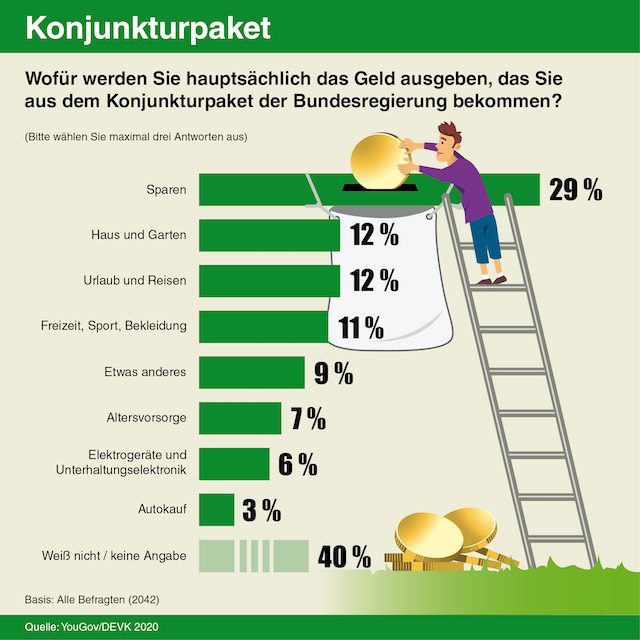 Die Milliardenhilfen, die die Bundesregierung im Rahmen ihres Konjunkturpakets zur Verfügung stellt, verbessern nicht automatisch die Kauflaune der Deutschen. Vielmehr legen sie während der Krise das Geld lieber auf die hohe Kante. Zu diesem Ergebnis kommt eine repräsentative Yougov-Befragung von mehr als 2.000 Bundesbürgern im Auftrag der DEVK . Die Zurückhaltung ist dabei groß, 40 Prozent der Befragten haben noch keine Meinung. Bei denjenigen, die schon einen Plan haben, was sie mit dem Geld machen wollen, steht Sparen mit 29 Prozent ganz oben auf der Prioritätenliste.