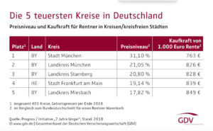Die Kaufkraft der Renten in Deutschland variiert je nach Region. Konkret heißt das, in München, dem teuersten Altersruhesitz, beträgt die Kaufkraft von 1.000 Euro Rente im Durchschnitt gerade einmal 760 Euro. Im bundesweit günstigsten Ort, dem brandenburgischen Landkreis Elbe-Elster dagegen, entsprechen 1.000 Euro einer Kaufkraft von 1.160 Euro. Diese Zahlen hat nun das Forschungsinstitut Prognos für die Initiative „7 Jahre länger“ des Branchenverbands GDV ermittelt.
