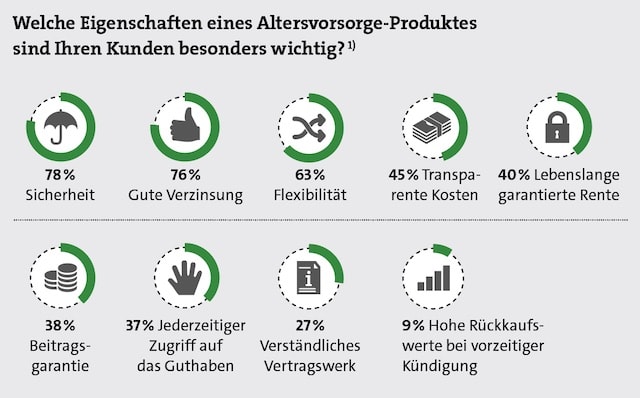 Der Niedrigzins erschwert nicht nur die Darstellung von Garantien, er erschwert auch ganz allgemein die Altersvorsorge-Beratung. 55 Prozent geben an, dass sich die Anforderungen an Altersvorsorge-Produkte durch die Niedrigzinsphase in den vergangenen fünf Jahren grundsätzlich verändert haben. Zehnjährige Bundesanleihen rentieren bereits seit fünf Jahren mit weniger als einem Prozent, seit dem Frühjahr 2019 liegt die Rendite gar im Minusbereich. Große Veränderungen, die wieder zu auskömmlichen Renditen sicherer Anleihen führen – vor rund 20 Jahren gab es immerhin 5 Prozent auf die Zehnjährigen –, sind vorerst nicht zu erwarten. Die neuen Anforderungen dürften daher zum Standard werden. Neben den niedrigen Zinsen haben aber auch die Regulierung (12 Prozent) und veränderte Kundenbedürfnisse (16 Prozent) die alte Produktlandschaft infrage gestellt.