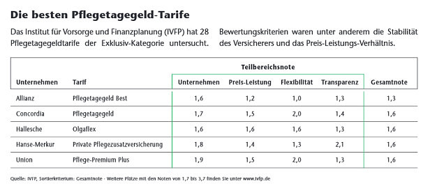 Bei den Pflegetagegeldpolicen gibt es einen festgelegten Geldbetrag pro Tag. Diese Policen sind meist günstiger, die Beiträge dafür aber nicht garantiert – sie können also angepasst werden. Eine Tabelle mit guten Pflegetagegeldpolicen finden Sie auf Seite 67. Bei der neuen Produktlinie Pflege-Garant der Continentalen können Kunden ein Pflege-Tagegeld zwischen 10 und 150 Euro absichern. Beim Einstiegstarif ist nur Pflegestufe III versichert, die Tarife Komfort und Komfort-plus zahlen bei Pflegestufe 0 bis III.