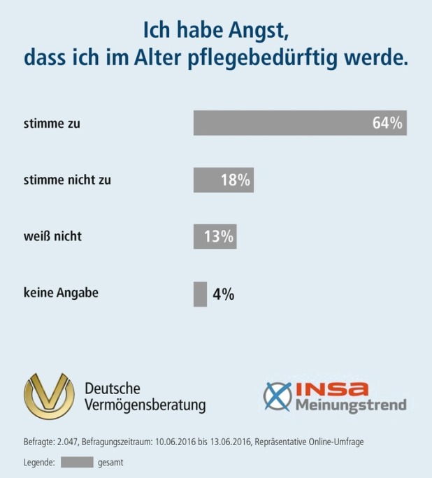Rund 64 Prozent der Deutschen haben Angst, später einmal pflegebedürftig zu werden. Trotzdem handeln sie nicht. Und das, obwohl die gesetzliche Pflegeversicherung oft nicht ausreicht. Nur 15 Prozent der Bundesbürger, darunter mehr Männer (18 Prozent) als Frauen (13 Prozent), haben privat vorgesorgt und eine Pflegeversicherung abgeschlossen. Das zeigt eine Umfrage des Meinungsforschungsinstituts Insa unter 2.047 Personen im Auftrag der Deutschen Vermögensberatung (DVAG).