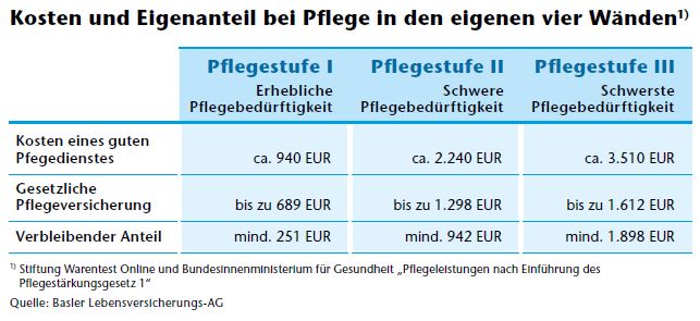 Die Kosten für die Betreuung pflegebedürftiger Menschen werden weithin unterschätzt. So weist die Basler Lebensversicherung darauf hin, dass ein leistungsstarker Pflegedienst monatlich bis zu 3.500 Euro kostet. Dabei ist noch nicht einmal der Aufenthalt in einer externen Einrichtung enthalten. Unterstellt wurde, dass die Pflegeleistungen zu Hause erbracht werden. Ist das nicht möglich, steigt der Betreuungsaufwand nochmals.