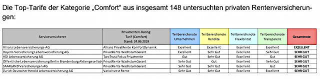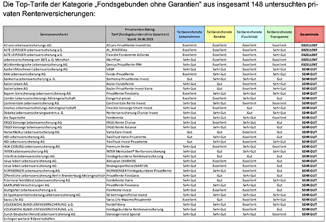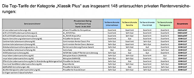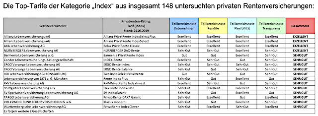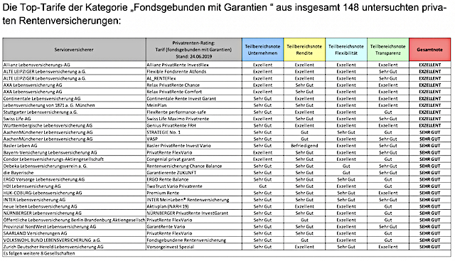 148 Tarife von 53 Anbietern haben die Analysten des Instituts für Vorsorge und Finanzplanung (IVFP) in ihrem zehnten Rating von privaten Rentenversicherungen auf bis zu 89 Kriterien untersucht. Die Tarife wurden dabei den Kategorien klassisch, Klassik Plus, Index, fondsgebunden mit und ohne Garantien sowie Comfort zugeordnet.