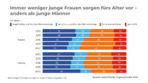 Größere Unterschiede zwischen den Geschlechtern treten wieder zu Tage, wenn es um die Art der Vorsorge geht – allen voran beim Aktiensparen: Zwischen 2016 und 2022 hat sich der Gesamtanteil derjenigen verdreifacht, die aktien- und fondsbasiert für ihre Rente sparen – von 16 auf 50 Prozent, allerdings nur gesamtgeschlechtlich gesehen. Denn während bei den jungen Männern bereits 62 Prozent auch auf Aktien und Fonds setzen, sind es bei den jungen Frauen lediglich 34 Prozent. Immerhin ist dieser Wert im Vergleich zur letzten Erhebung im Jahr 2019 stark angestiegen von damals 18 Prozent.