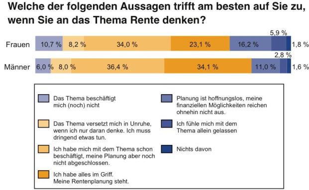 Frauen beschäftigen sich laut Aon-Hewitt-Studie deutlich weniger mit dem Thema Altersvorsorge als Männer. Demnach beschäftigen sich 57 Prozent der Frauen mit der Planung ihrer Rente oder haben diese schon abgeschlossen. Bei den Männern sind es hingegen 70 Prozent (siehe Grafik).