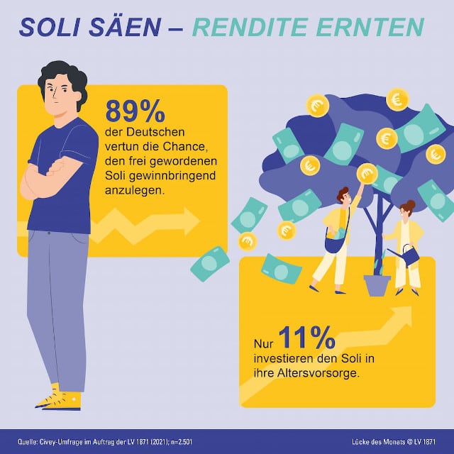 Während nur knapp jeder zehnte Bundesbürger (11 Prozent) das Geld aus dem Wegfall des Solidaritätszuschlags (Soli) anlegt, nutzen 89 Prozent dieses Geld nicht. Das hat eine repräsentative Umfrage der LV 1871 gemeinsam mit Civey ermittelt.