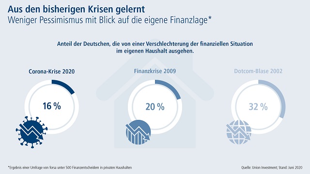 Trotz der Krise glauben zudem knapp drei Viertel der Befragten, dass sich die finanzielle Situation in ihrem Haushalt in den kommenden sechs Monaten nicht ändert. 12 Prozent rechnen mit einer Verbesserung, das sind allerdings nur noch halb so viele wie im Vorquartal (23 Prozent). Auch die Zahl derer, die von einer Verschlechterung ausgehen, hat sich im Vergleich zum Vorquartal verdoppelt. Sie liegt nun bei 16 Prozent, aber damit noch unter dem Wert zu Zeiten der Finanzkrise. Noch mehr Pessimisten gab es nur im vierten Quartal 2002, direkt nach der geplatzten Dotcom-Blase. Damals rechneten sogar 32 Prozent mit einer Verschlechterung der eigenen finanziellen Situation, wie die Grafik zeigt.