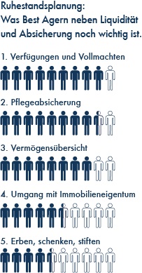 Geht es um die Vorbereitung auf den eigenen Ruhestand, sind die Themen „Vollmachten und Verfügungen“ sowie „Organisation einer Pflegeabsicherung“ für neun von zehn Best Agern genauso wichtig wie die klassischen Themen Renten und Versicherungen. Das zeigt eine Umfrage der A.S.I. Wirtschaftsberatung unter Kunden der Generation 50plus.