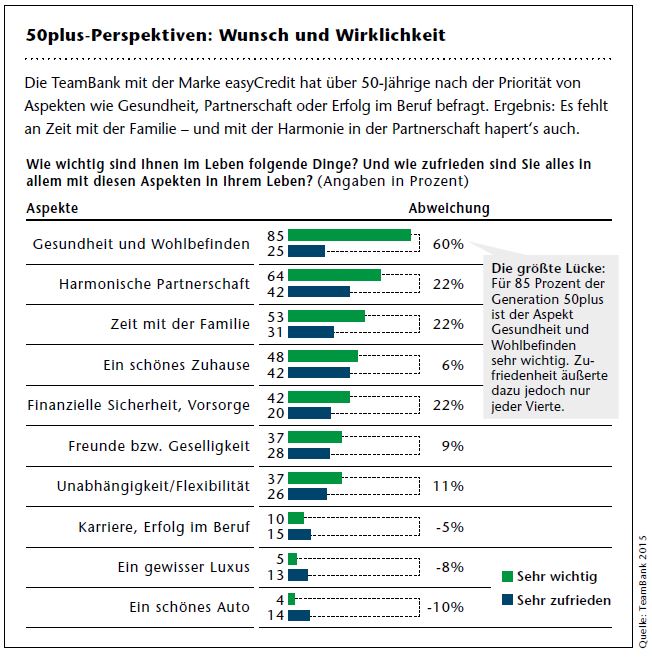 Was bedeutet das für die private Vorsorge? In einer Easy-Credit-Studie des Kreditfinanzierers Team Bank wird klar, dass sich die Generation 50plus der Lücken in der eigenen Altersabsicherung durchaus bewusst ist. Für zwei von drei Befragten besteht Nachholbedarf in Finanzfragen. Alexander Boldyreff, Vorstandsvorsitzender der Team Bank, sagt: „In den letzten Arbeitsjahren bietet es sich an, die bisherige Vorsorge zu überprüfen und den Ruhestand gewissenhaft vorzubereiten.“ Dazu fehlt vielen die Übersicht. 45 Prozent der 50 bis 79-Jährigen kennt die Summe, die ihnen monatlich zur Verfügung steht, nur in etwa.