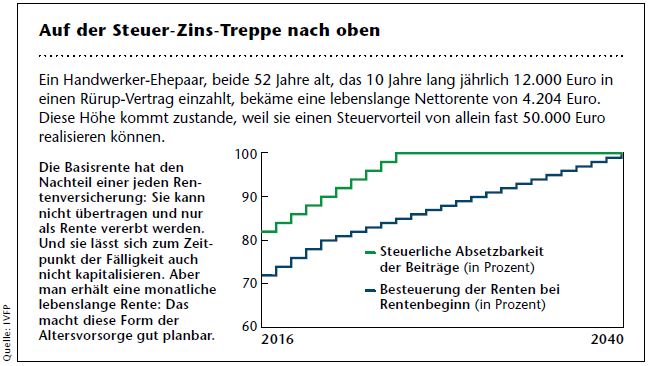 „Dabei ist mit der Basisrente ein für die Zielgruppe 50plus sehr gut geeignetes Produkt doch längst am Markt“, sagt IVFP-Experte Hauer. Bekannt ist diese auch unter dem Namen Rürup-Rente – sie fristete eher ein Schattendasein. Vielleicht auch, weil es für die Basisrente keine staatlichen Zulagen gibt, wie das bei der Riester-Rente der Fall ist. So galt sie mit ihren festen Fördergrenzen bislang nur geeignet für Selbstständige. Doch das hat sich nun geändert. Seit 2015 können maximal 22.172 Euro für Ledige und 44.344 Euro für Verheiratete als Beitrag für eine Basisrente von der Steuer abgesetzt werden. Wie bereits bei der Riester-Rente lassen sich auch bei der Basisrente bis zu zwölf Monatsleistungen in einer Auszahlung zusammenfassen.