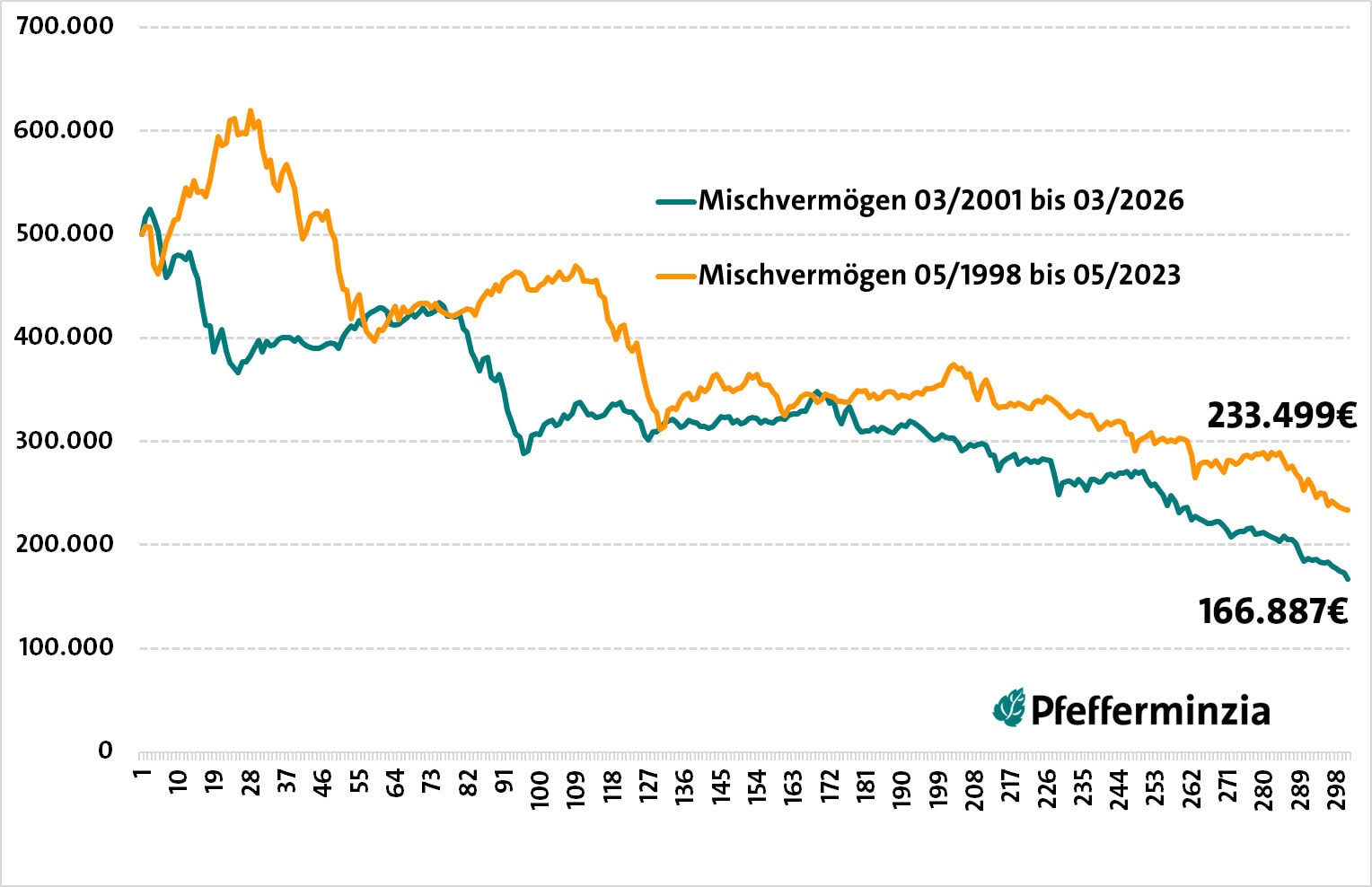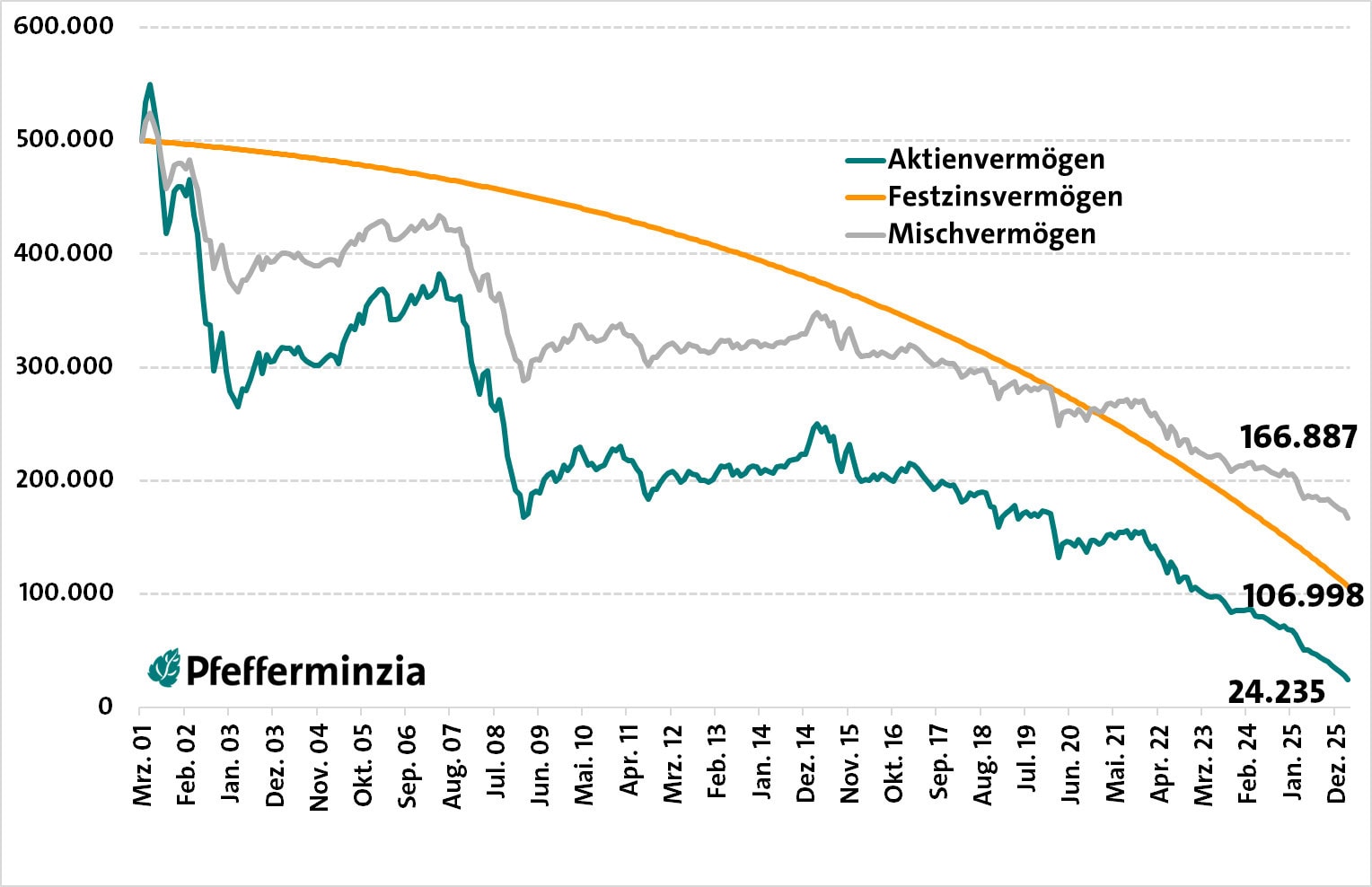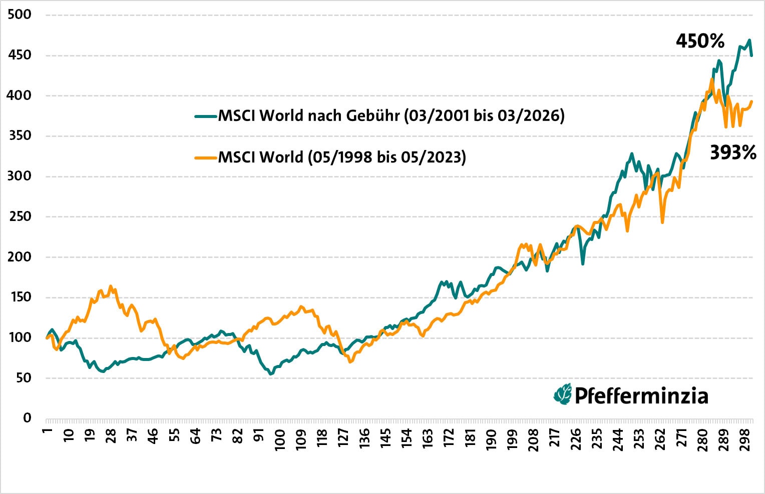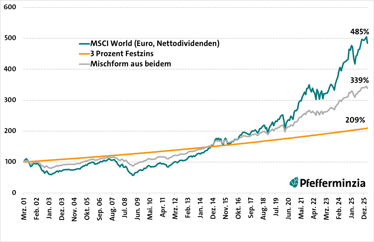 Der aktuelle Zeitraum reicht von März 2001 bis März 2026. Er beginnt also ganz anders als der in der Rechnung vor drei Jahren. Während es damals noch ein Stück aufwärts ging, geht es hier gleich mitten im berüchtigten Salami-Crash zur Jahrtausendwende los. Bis März 2003 hieß es mit den Kursen: Ab in den Keller. Nach 25 Jahren stand dennoch eine Rendite von 6,5 Prozent.