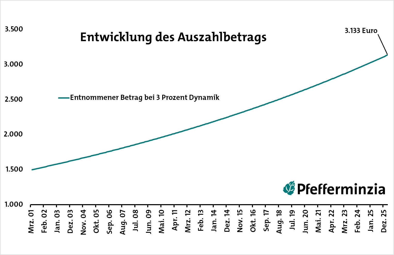 Damit liegen die Karten auf dem Tisch. Was machen wir nun daraus? Zunächst ermitteln wir jenen Betrag, der monatlich aus dem Vermögen ab- und aufs Konto drauffließen soll. Wir beginnen mit 1.500 Euro, was im Versicherungssprech einem Rentenfaktor von 30 entspricht. In Zeiten wie den aktuellen ist das gar nicht übel. Hinzu kommt die Dynamik von 3 Prozent, die die Inflation ausgleichen soll und das Ganze zu einer Kurve werden lässt.