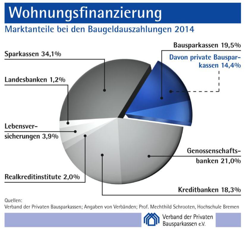 Das meiste Geld für die private Baufinanzierung kommt von den Sparkassen. Sie zahlten 2014 zirka 56,6 Milliarden Euro aus und haben damit einen Marktanteil von 34,1 Prozent. Den zweiten Platz mit 34,9 Milliarden Euro belegen die Genossenschaftsbanken. Platz 3 und 4 nehmen, wie der Verband der Privaten Bausparkassen aktuell mitteilte, die Bausparkassen mit 32,4 und die Kreditbanken mit 30,4 Milliarden Euro ein.