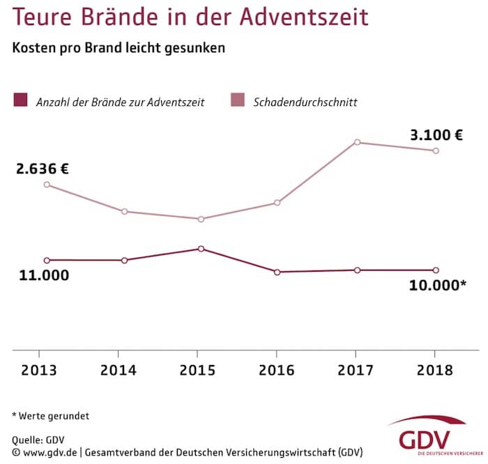 „Häufige Brandursachen sind in Flammen aufgegangene Adventskränze oder Weihnachtsbäume“, teilt der GDV mit. Hinzu kämen zum Jahreswechsel die Risiken durch querfliegende Silvesterraketen und unachtsam gezündete Feuerwerkskörper. Insgesamt leisteten die deutschen Versicherer für etwa 400.000 Feuerschäden im gesamten Jahr 2018 rund 1,5 Milliarden Euro, so der Verband.